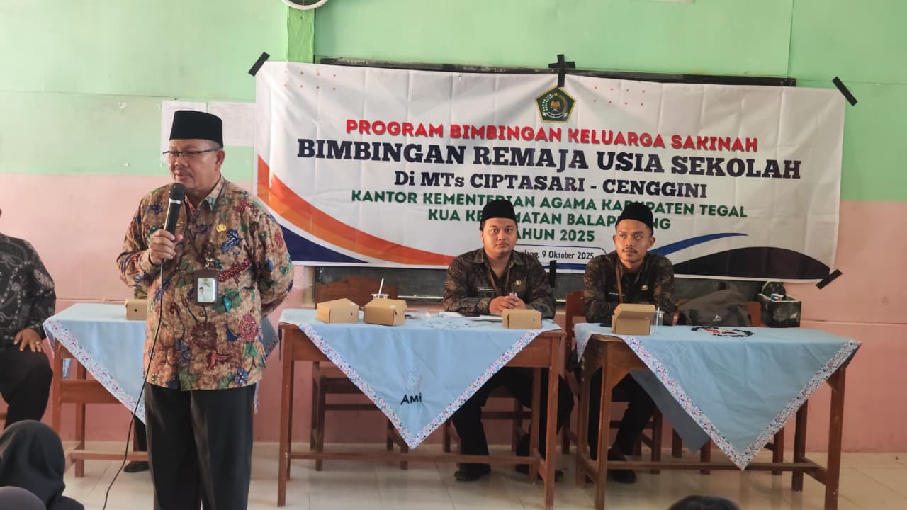 Balapulang – Kamis (9/10/2025) KUA Kecamatan Balapulang menyelenggarakan kegiatan Bimbingan Remaja Usia Sekolah (BRUS) yang bertempat di MTS Ciptasari Balapulang. Kegiatan ini diikuti oleh 70 siswa dan siswi dengan tujuan memberikan bimbingan agama, pembinaan karakter, serta pengembangan pengetahuan dan keterampilan remaja sesuai nilai-nilai Islam. Kegiatan ini merupakan upaya KUA Kecamatan Balapulang dalam membina generasi muda agar mampu menghadapi tantangan remaja dengan penuh iman, akhlak, dan tanggung jawab.