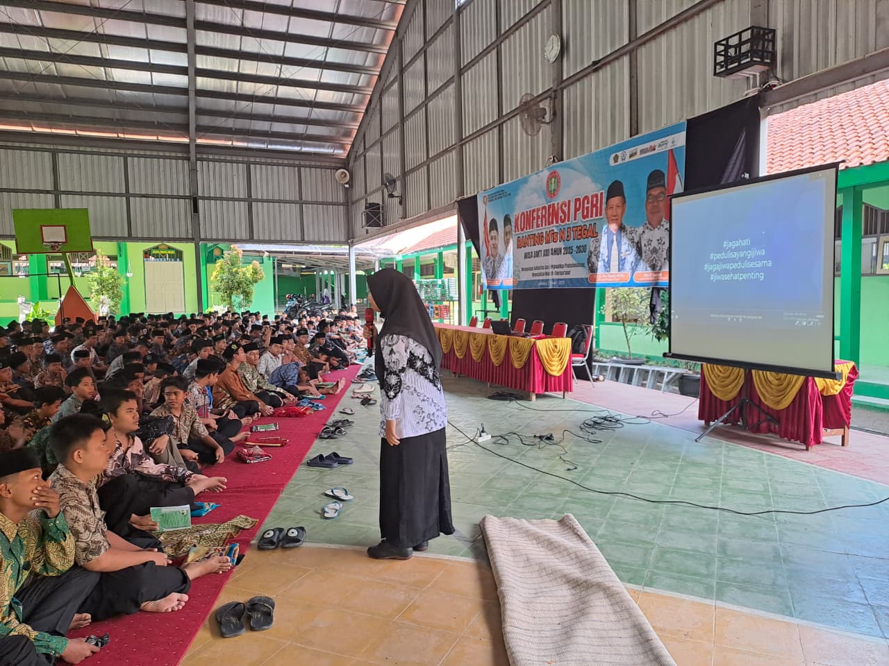 Diseminasi dilaksanakan di Indoor MTsN 3 Tegal setelah pelaksanaan shalat dhuha dan pembacaan Aqidatul Awam. Ratusan siswa masih berkumpul dengan penuh antusias untuk menyimak penjelasan mengenai pentingnya memahami dan menangani luka psikologis sejak dini.