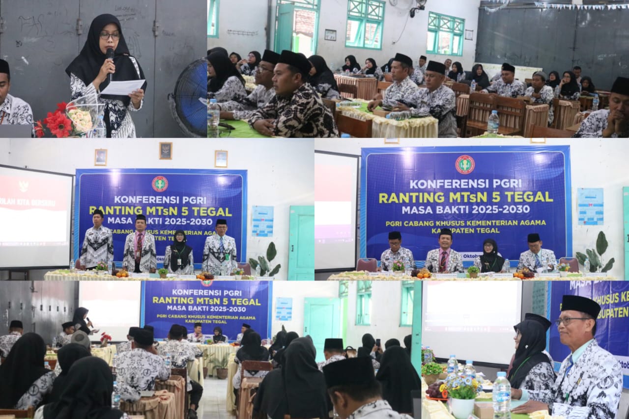 Pangkah — MTsN 5 Tegal menyelenggarakan Konferensi PGRI Ranting Masa Bakti 2025–2030, Sabtu (4/10/2025), dengan agenda utama membahas program kerja dan memilih pengurus baru. Kegiatan yang berlangsung di aula madrasah ini diikuti oleh seluruh guru dan pegawai MTsN 5 Tegal.