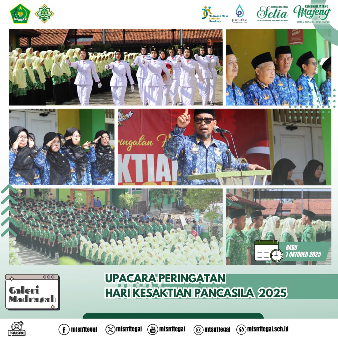 “Hari Kesaktian Pancasila mengingatkan kita pada perjuangan luar biasa para pahlawan dalam menjaga ideologi bangsa. Harapannya, anak-anak MTsN 1 Tegal tumbuh menjadi generasi SAKTI: Seihat, Aman, Kuat, Takwa, dan Iman. Semangat ini perlu diwujudkan melalui pembiasaan-pembiasaan baik dan pembelajaran di madrasah,” ungkapnya.
