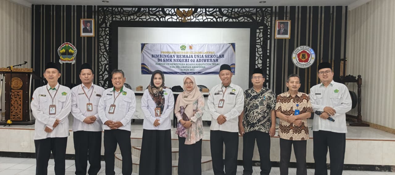 Adiwerna – Dalam upaya membentuk generasi muda yang tangguh, Penyuluh Agama Islam Kantor Urusan Agama (KUA) Kecamatan Adiwerna menyelenggarakan kegiatan Bimbingan Remaja Usia Sekolah di SMKN 2 Adiwerna pada hari Selasa (7/10/2025). Kegiatan ini mengusung tema “Remaja Cerdas Emosinya, Damai Jiwanya, Sukses Masa Depannya”, dan diikuti antusias oleh puluhan siswa dari berbagai jurusan. Dan ini menjadi wadah pembinaan mental dan spiritual bagi para siswa, khususnya dalam menghadapi tantangan dan tekanan di masa remaja.