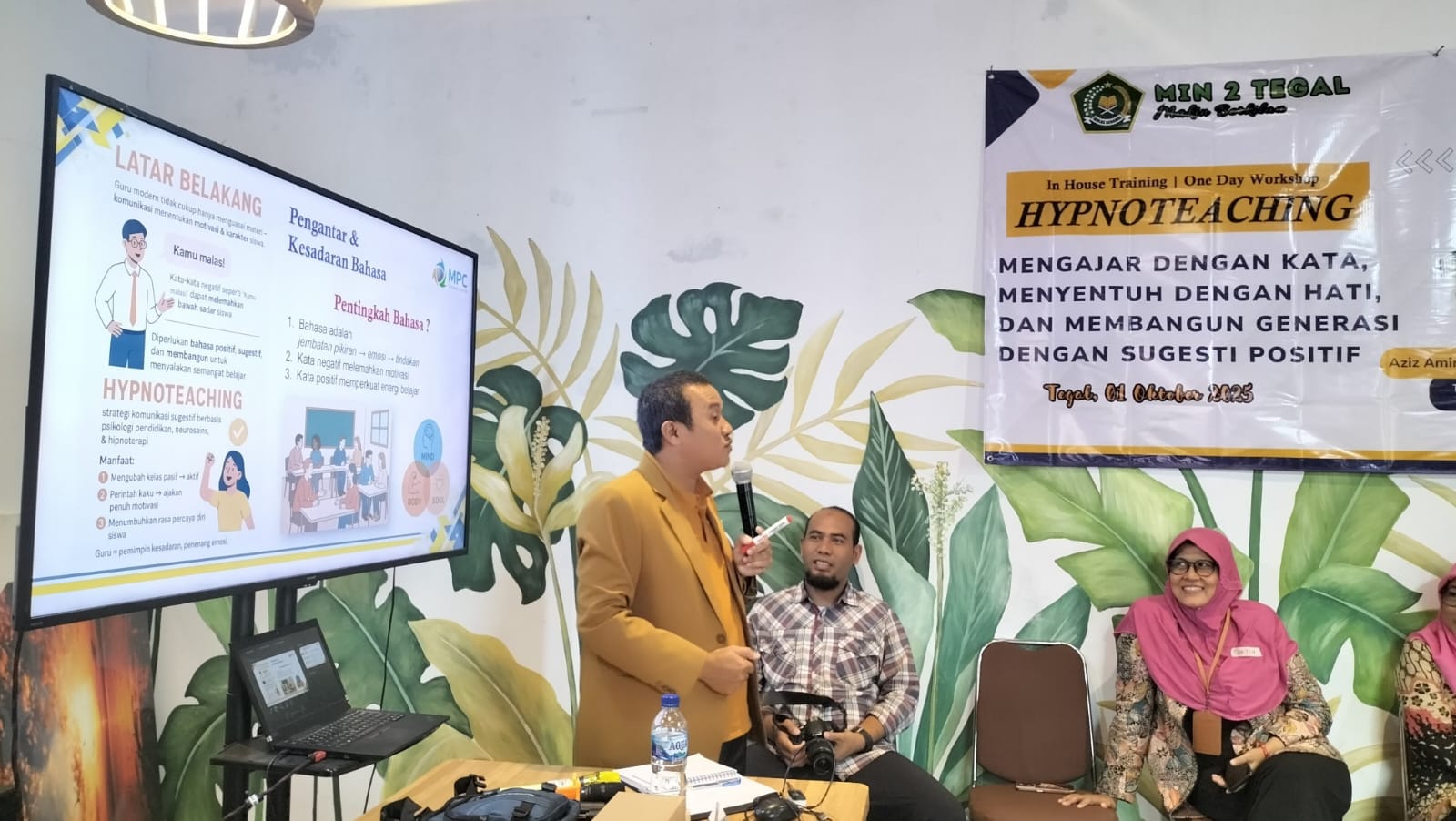 Kegiatan yang digelar pada Rabu (1/10/2025) ini merupakan tindak lanjut dari penelitian Aziz Aminudin, M.Pd Founder MPC Training Ceneter mahasiswa Program Pasacasarjana Magister Pedagogi UPS Kota Tegal tentang Pengembangan Modul Hypnoteaaching Berbasis Bahasa Positif di MIN 2 Tegal.